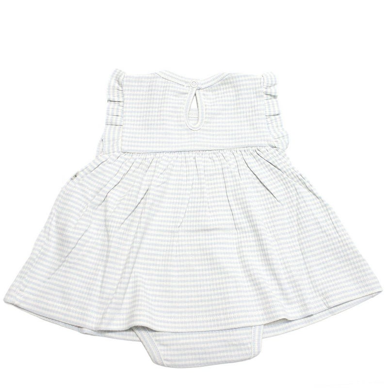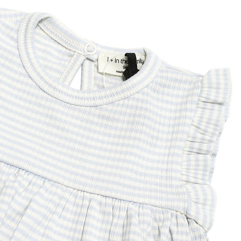 ナチュラルで柔らかい印象のボーダー柄ロンパース。