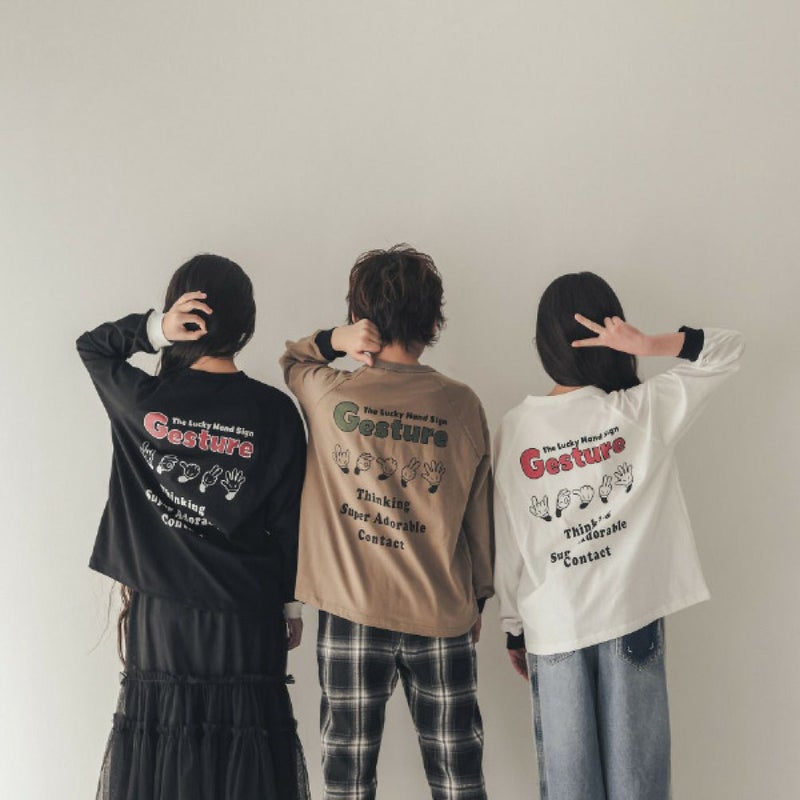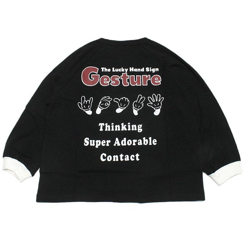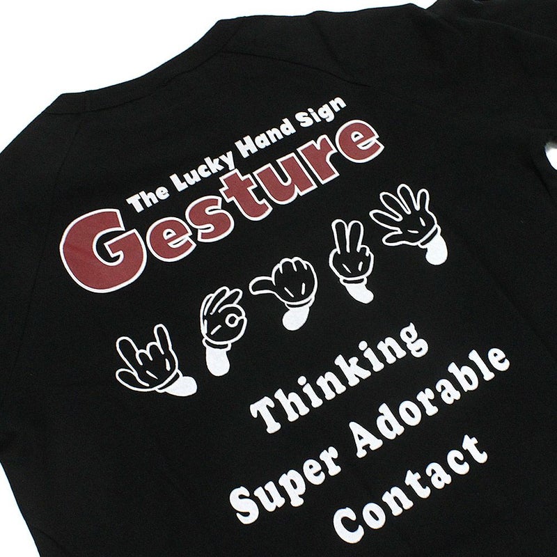 バックプリントの色んなハンドサインイラストが印象的。