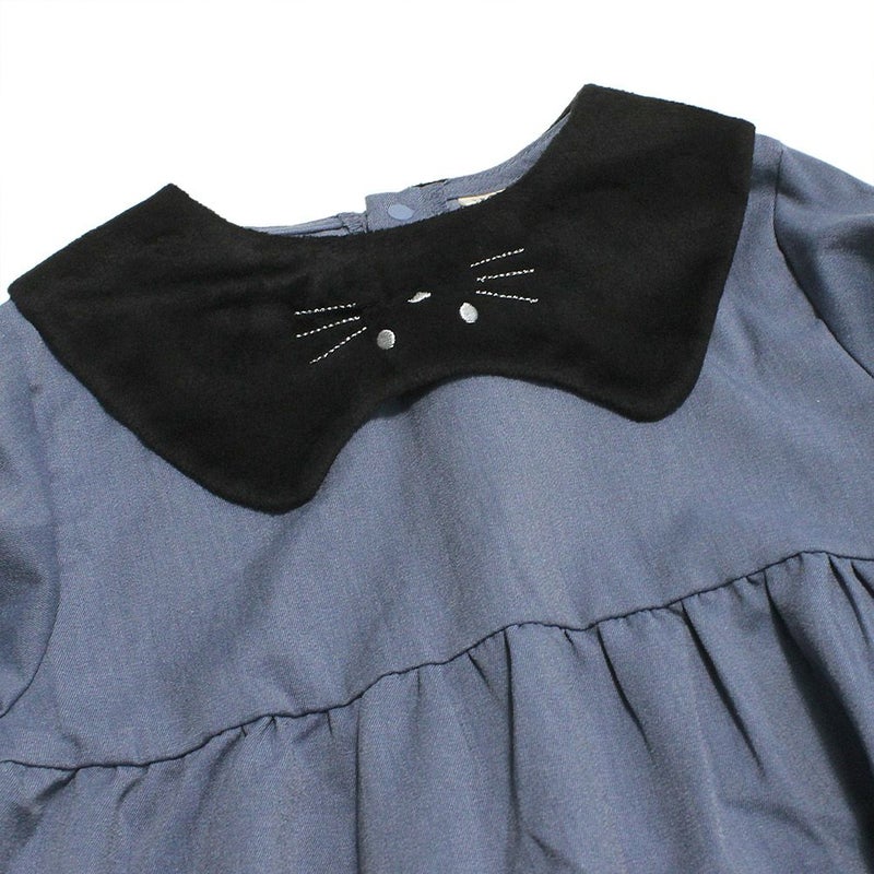ベロア素材の衿にネコちゃんの顔をあしらった一着。