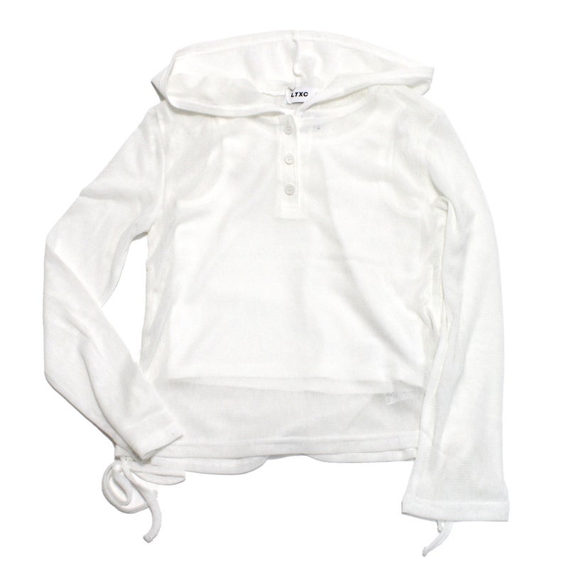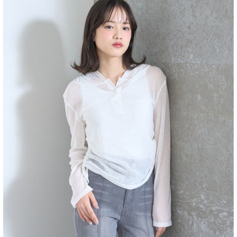 涼しげな透け感のフードつきのシアーニットカットソーです。