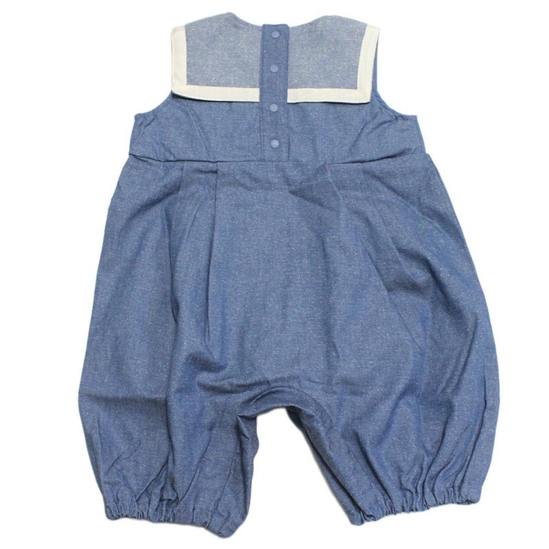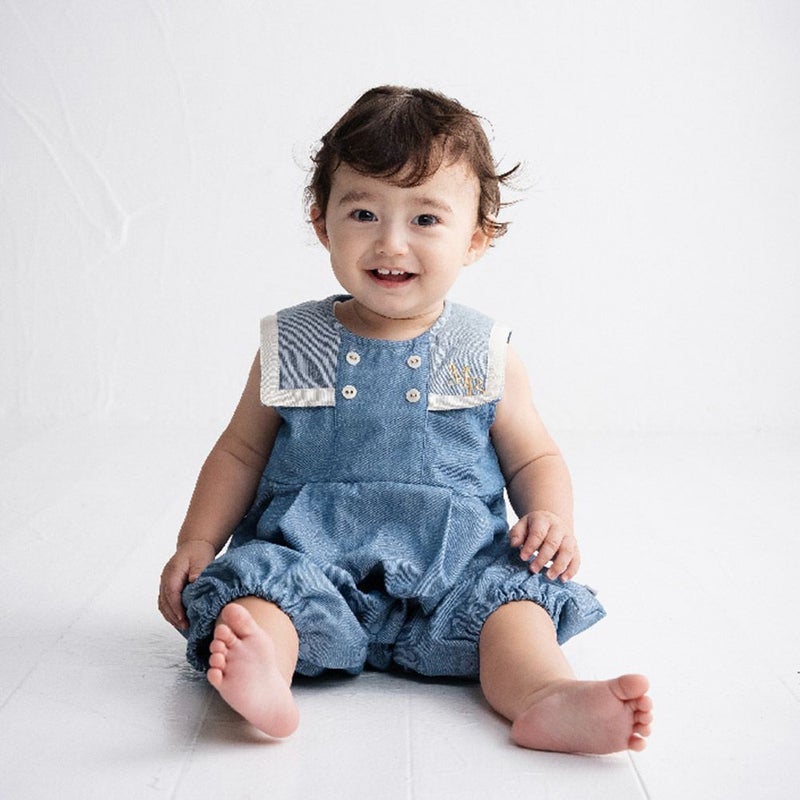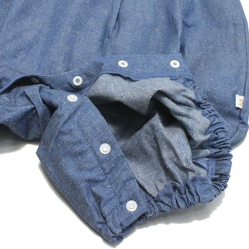 明るいブルーが爽やかなネップデニムのbabyロンパースです。