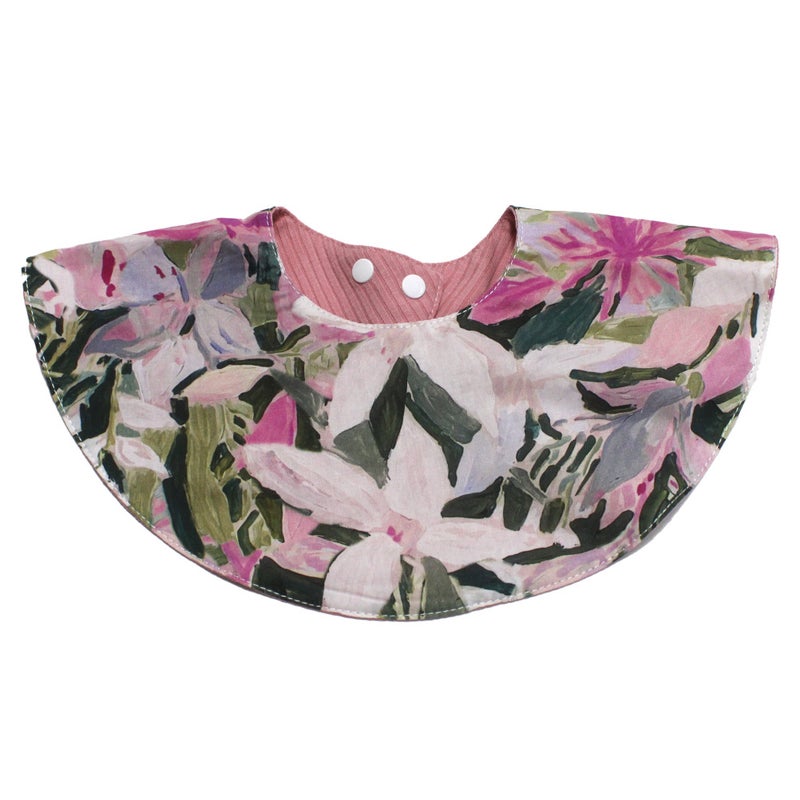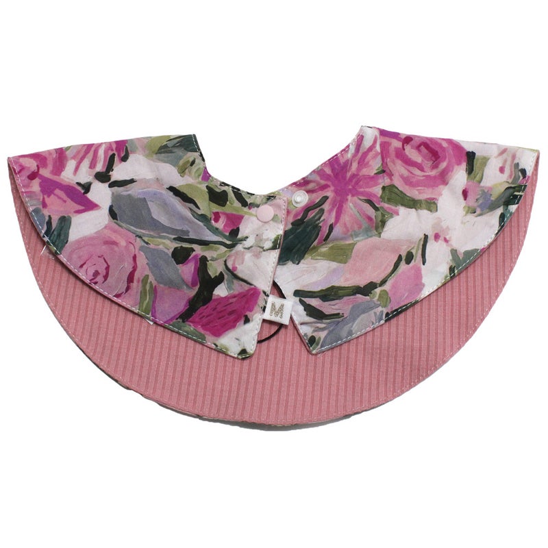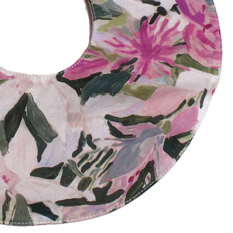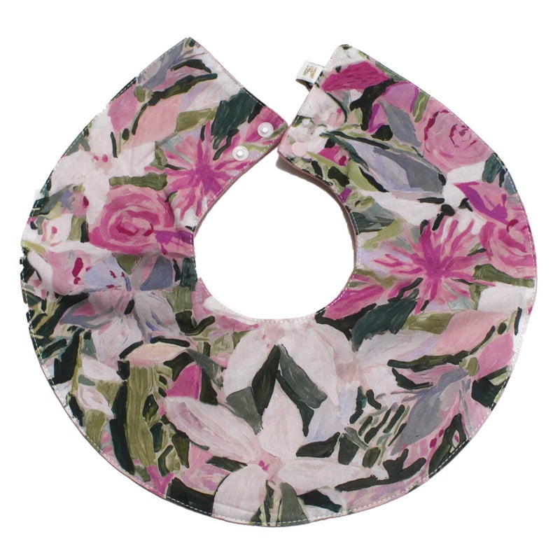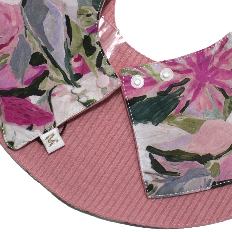 花柄、水彩タッチのドット柄の丸いスタイ。