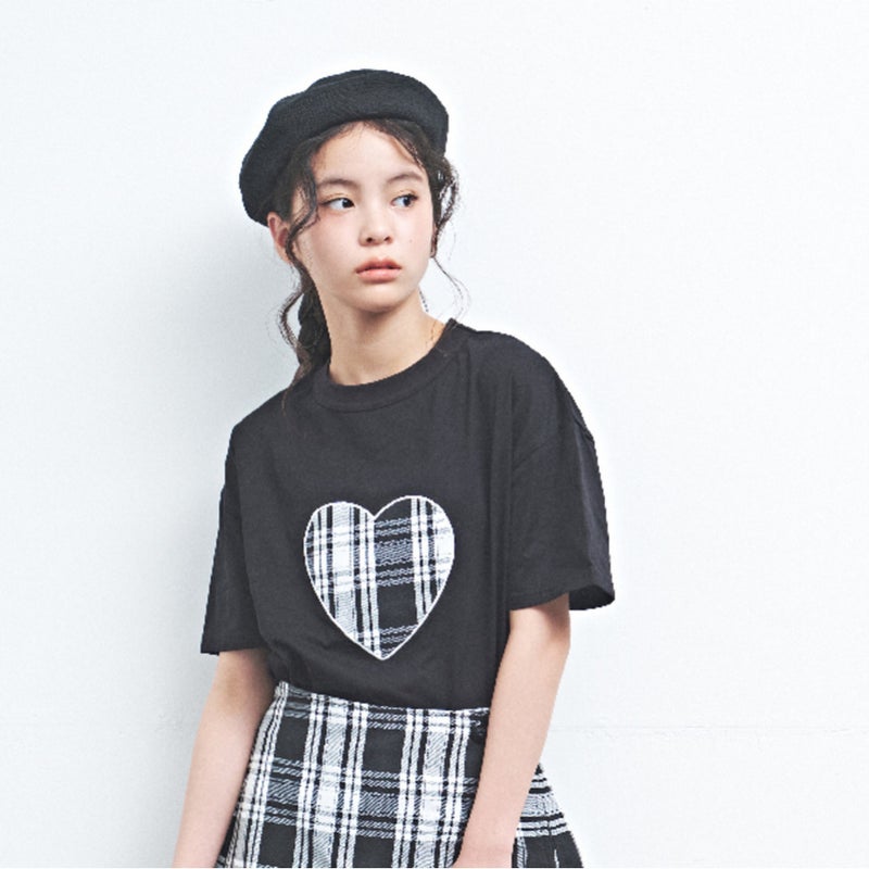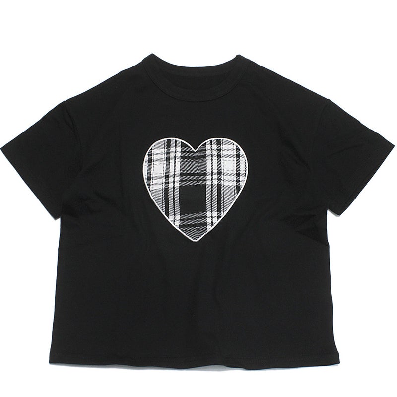 ギンガムチェックのハートが目を惹く半袖Tシャツ。
