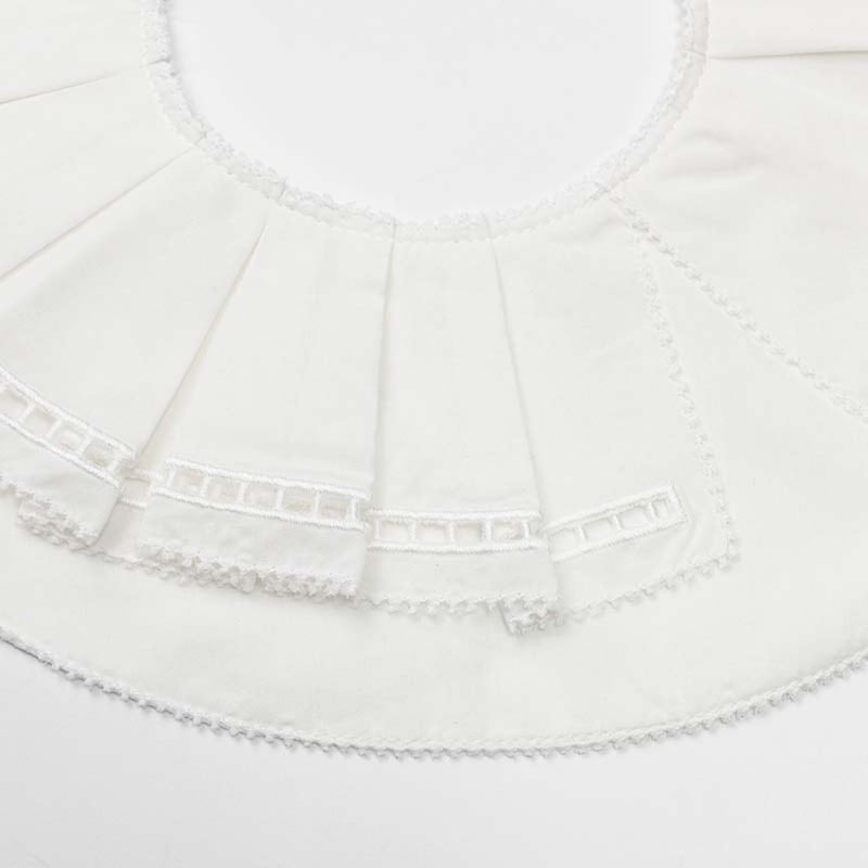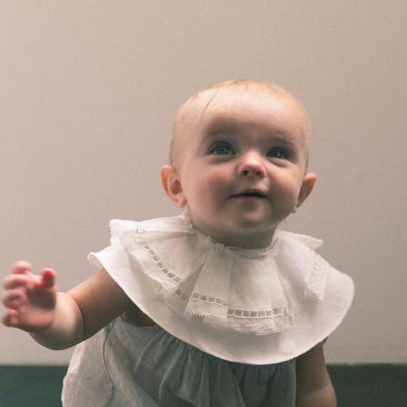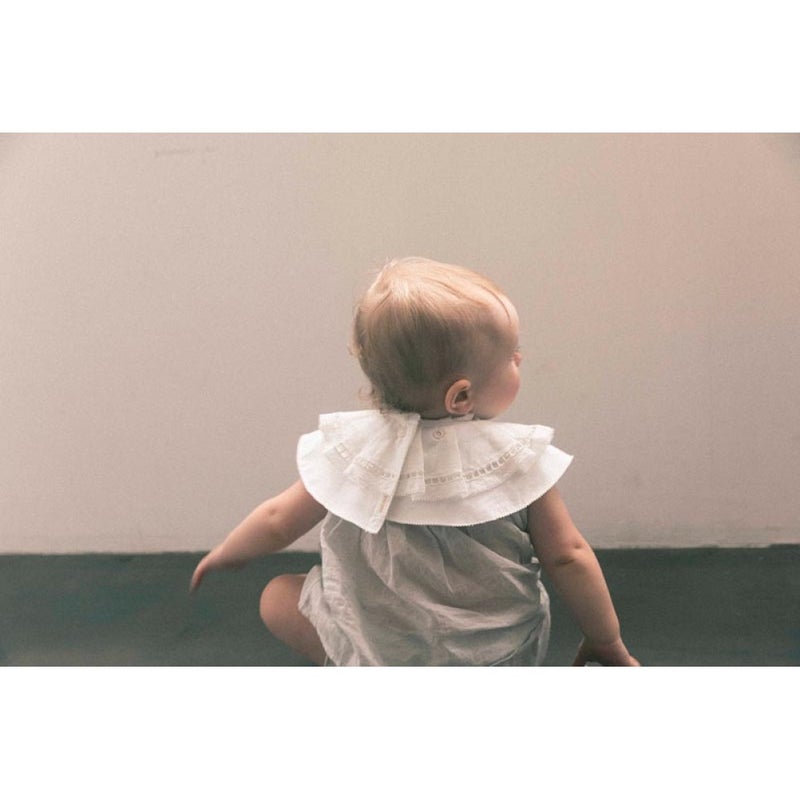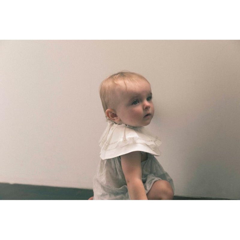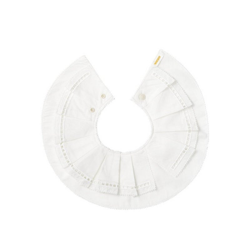 象徴的な形の「エリザベスカラー」からインスパイアされたビブは、ベビーの無垢な可愛らしさを引き立てるオフホワイト。