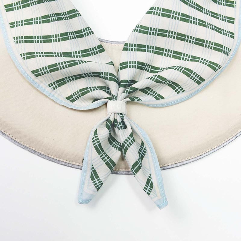 グリーンとブルーのチェック柄のスカーフは、マリンルックのコーディネートにもぴったり。