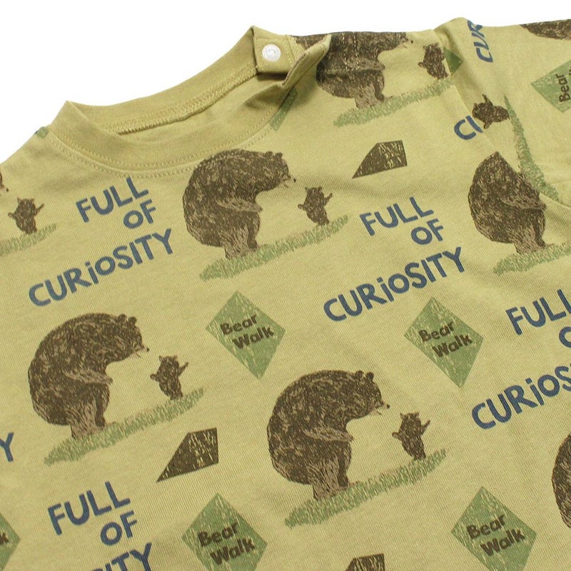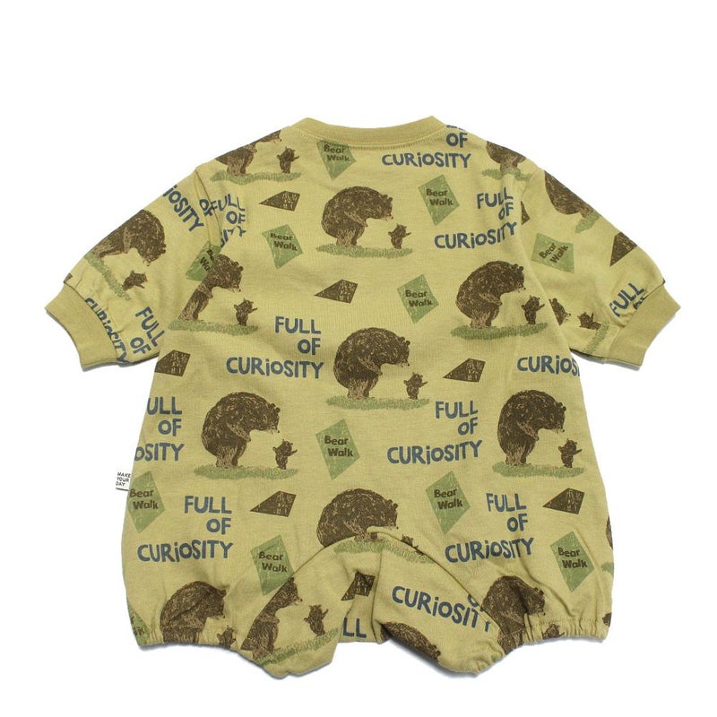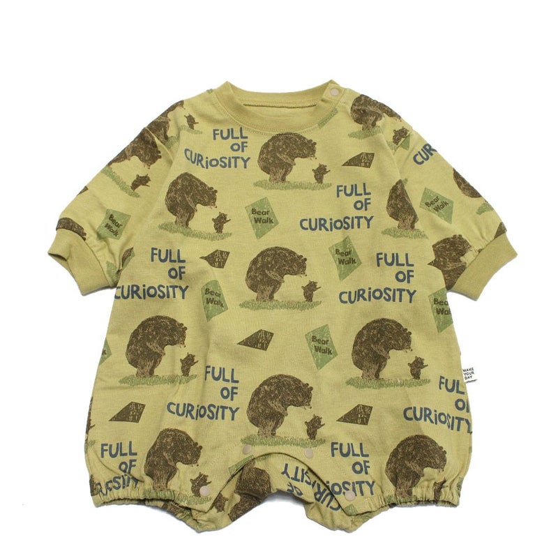 絵本のような柔らかいタッチで描かれたクマの親子イラストの総柄ロンパースです。
