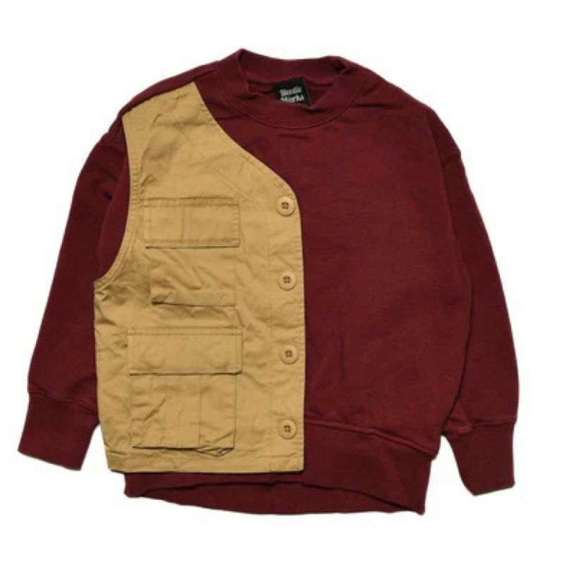 トレーナーにベストを縫い付けたようなリメイク風のデザイン。