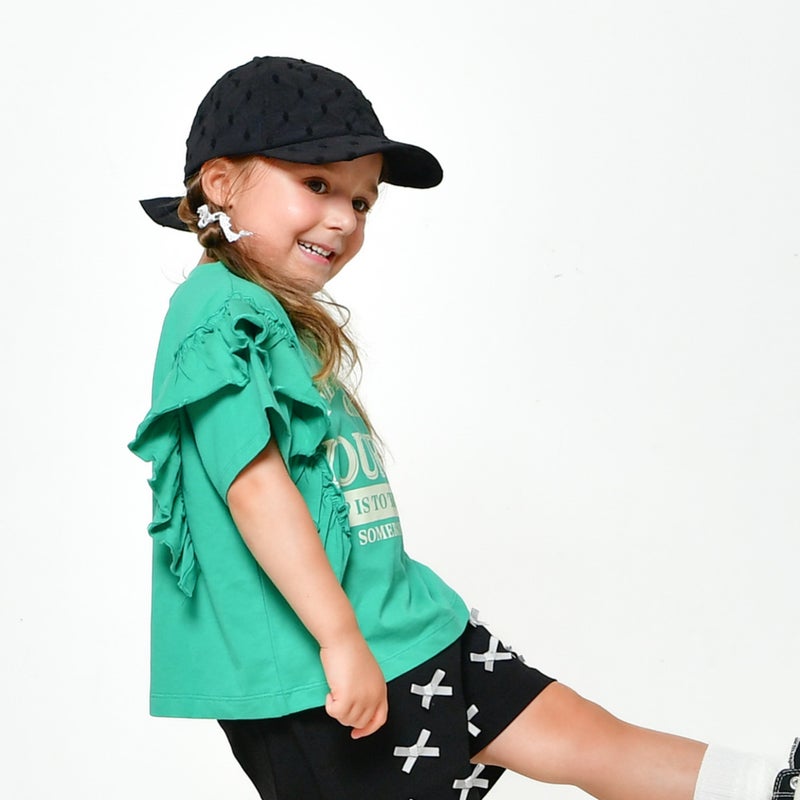 肩のフリルがガーリーなロゴTシャツ。