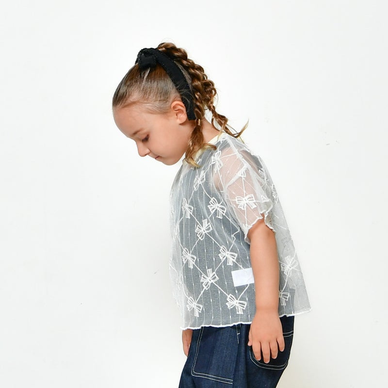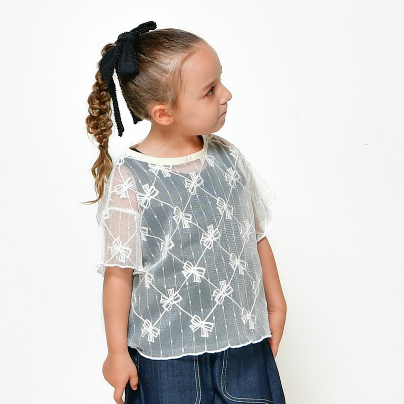 リボンのメッシュ生地がガーリーな半袖トップスです。