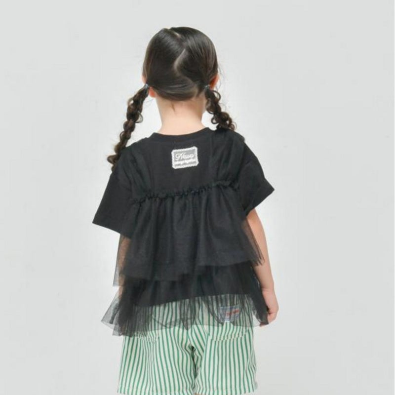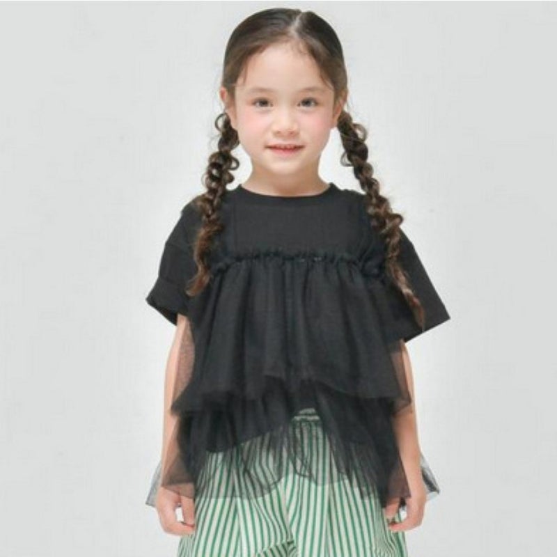シンプルな天竺のTシャツに、チュールを重ねたデザイン。