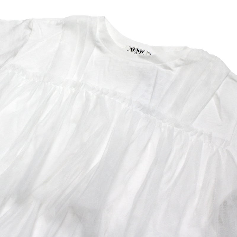 シンプルな天竺のTシャツに、チュールを重ねたデザイン。