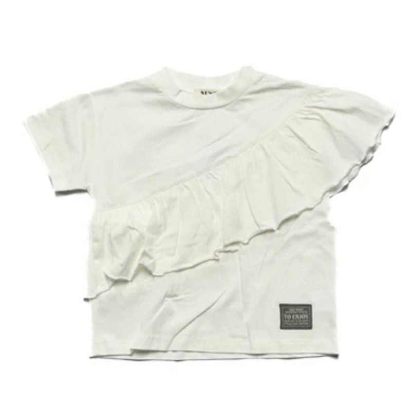 個性的なアシンメトリーデザインのフリルが魅力的なTシャツ