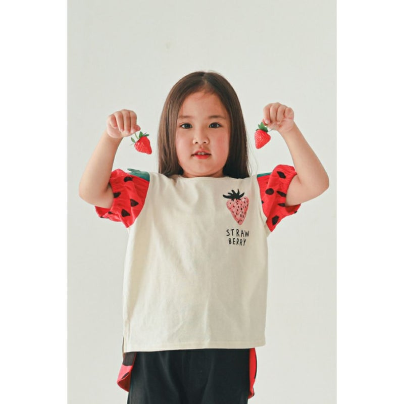 イチゴを再現した袖が目を惹くTシャツ。