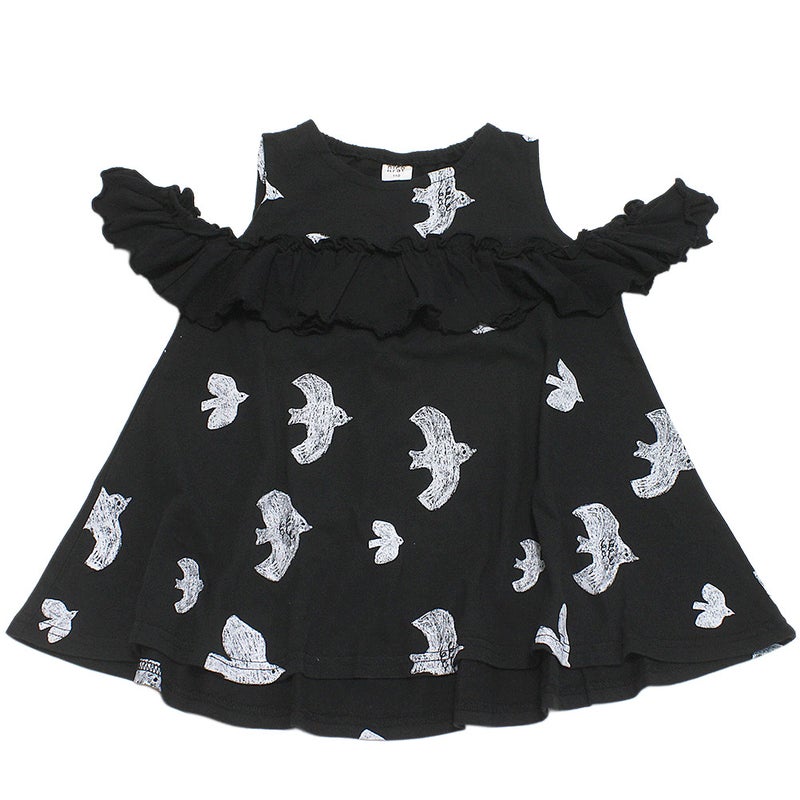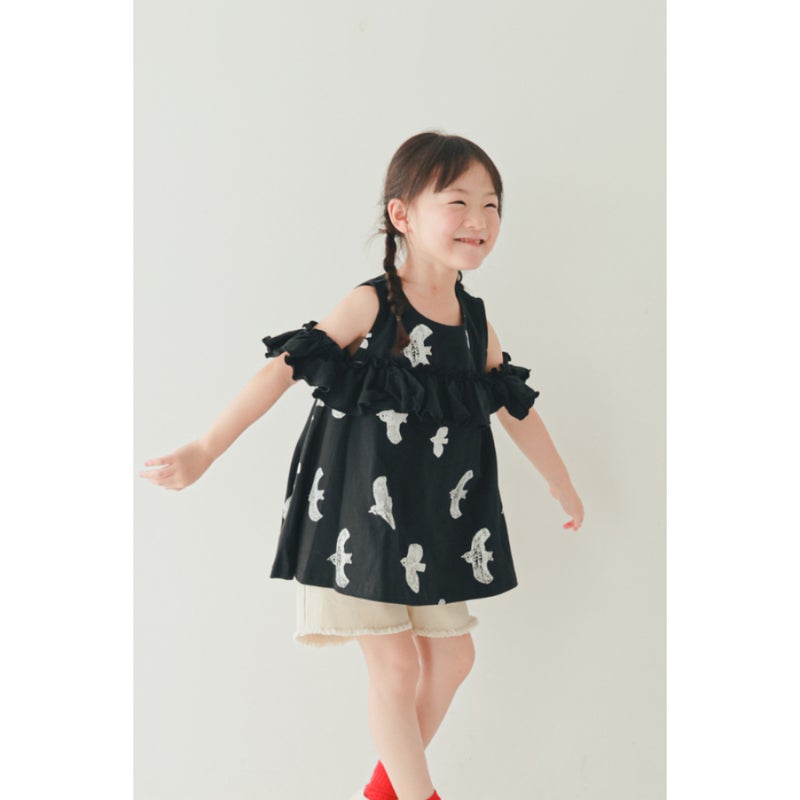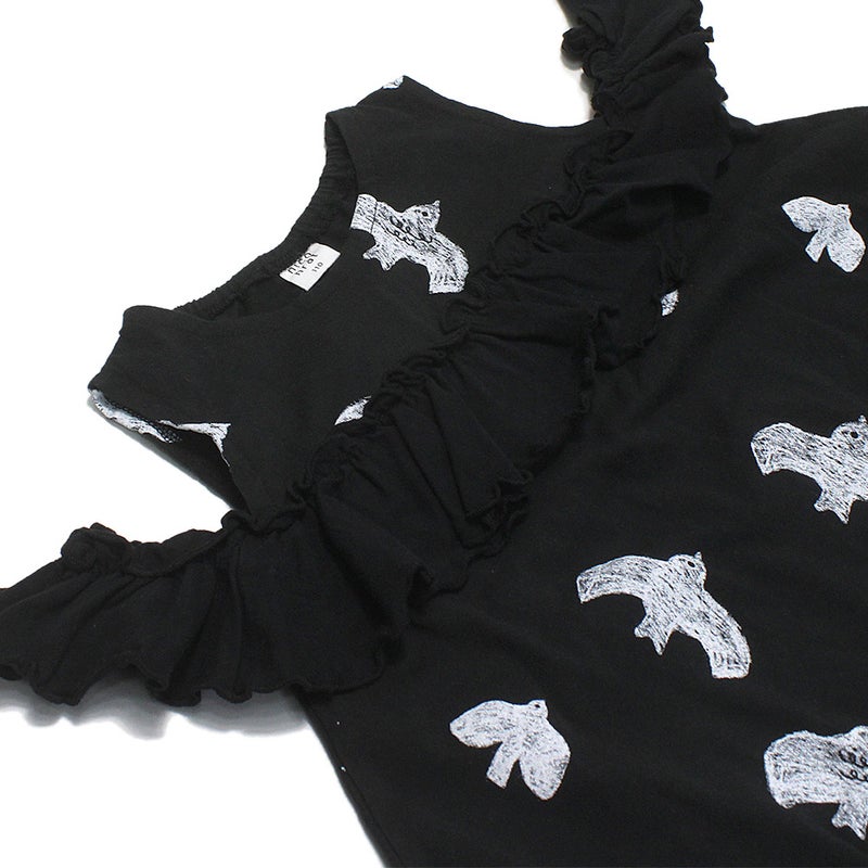 [ニコフラート] オフショルダーバードフリル Tシャツ ブラック(BK)