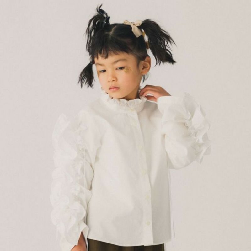 襟とスリーブにボリュームたっぷりのフリルをあしらったブラウス。