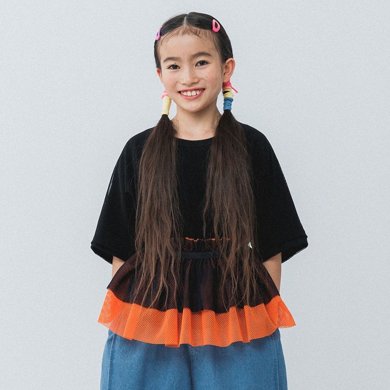 メッシュの様な雰囲気のチュールをレイヤードしたTシャツです。