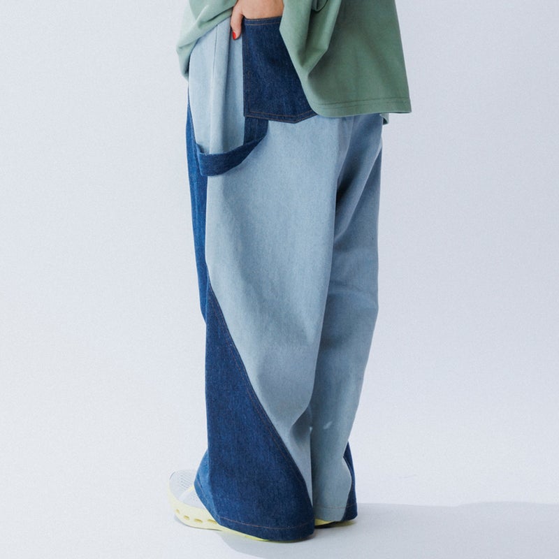 2色のデニムを合わせたデニムパンツ。