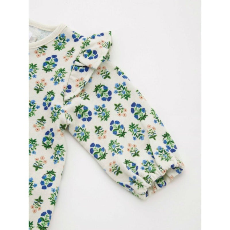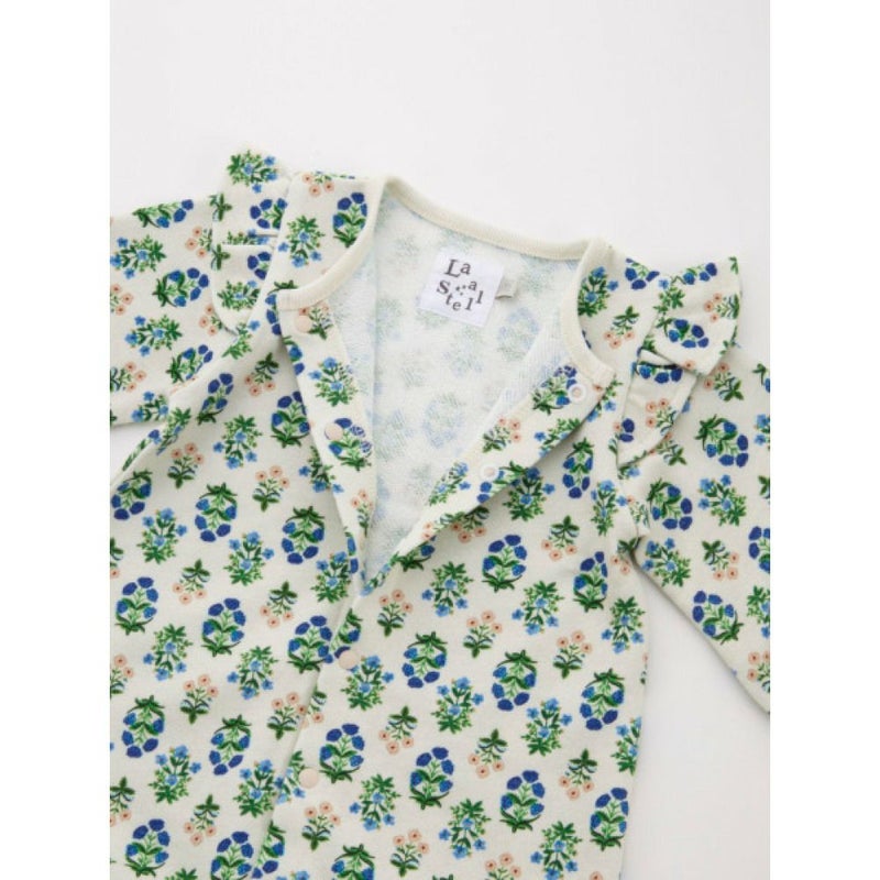 肩先にあしらったフリルと、袖口、足口に入ったギャザーが女の子らしいシルエット。