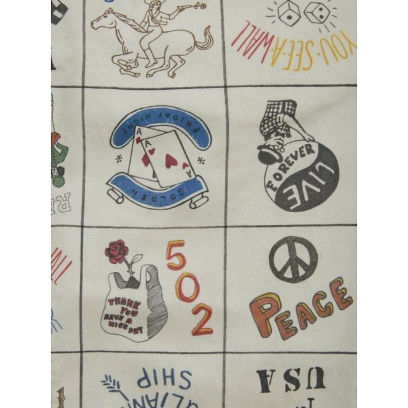 柄はレトロなワッペンをランダムに配置した柄と、手描きタッチの個性的なイラスト総柄、太ピッチのマルチカラーストライプの3柄展開。
