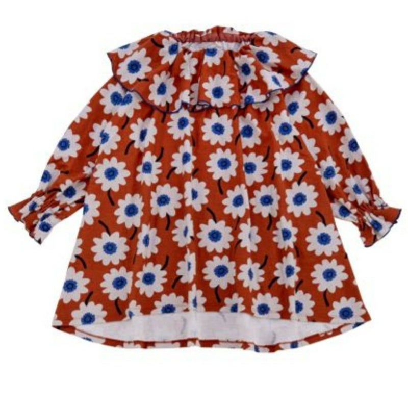 ボリュームたっぷりのフリルカラーが着映えする総柄ワンピース。