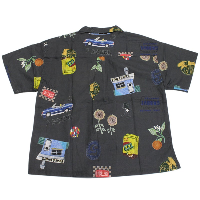 手書き風のポップな総柄プリントが目を惹く半袖シャツ。
