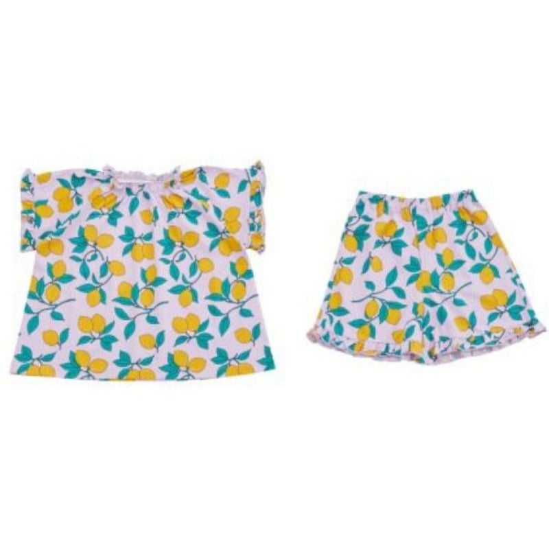 Aラインにふんわり広がるトップスと、裾フリルのショートパンツをセットにしました