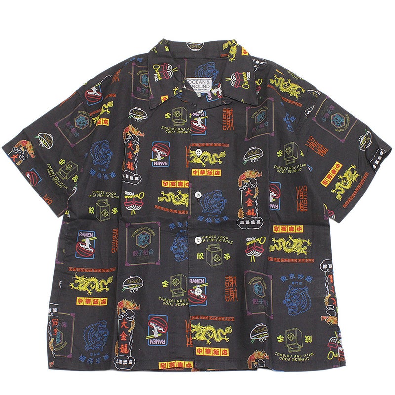 カラフルなイラストがインパクト抜群の総柄シャツ。