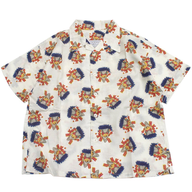 カラフルなイラストがインパクト抜群の総柄シャツ。