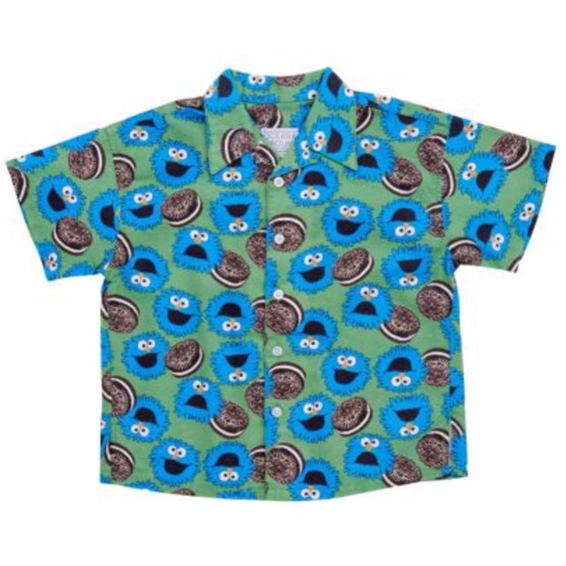 カラフルなイラストがインパクト抜群の総柄シャツ。