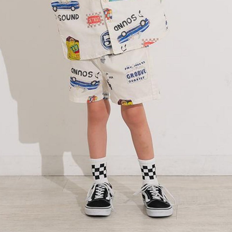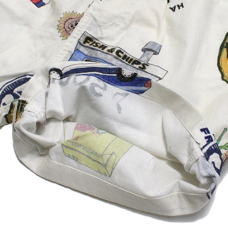 手描き風のイラストをプリントした総柄ショーツ。