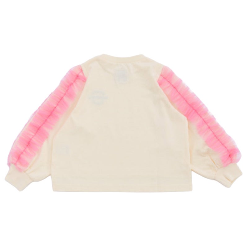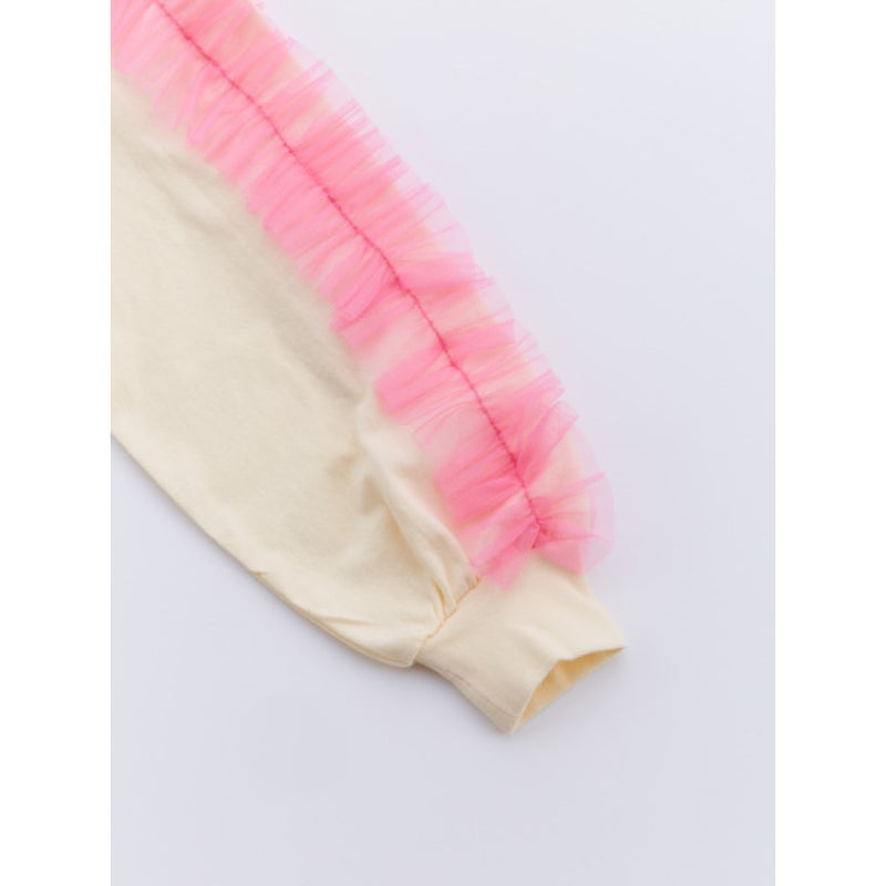 キラッと光るチュール素材のフリルが目を引く長袖Tシャツ。