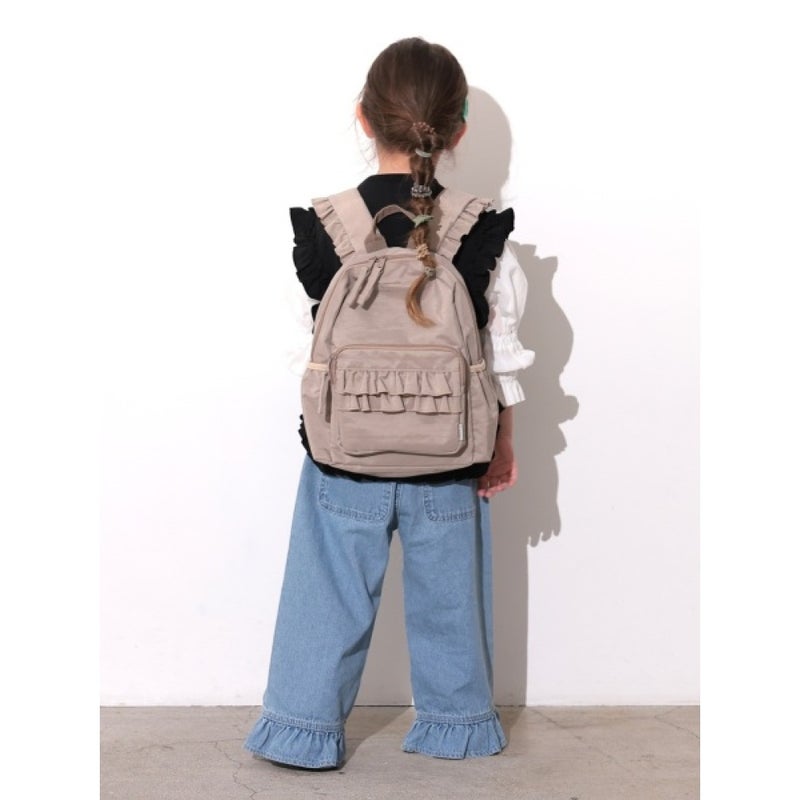 正面ポケットと肩紐に広がるたっぷりフリルでガーリーに。