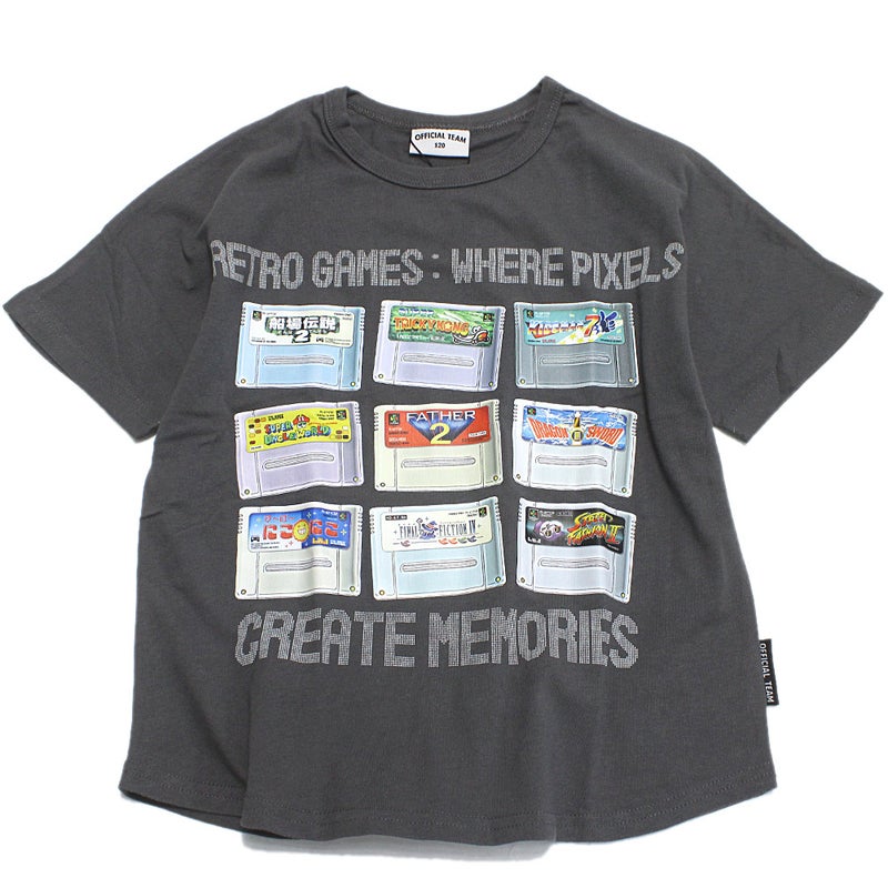 懐かしいゲームカセットが目を惹く半袖Tシャツです。