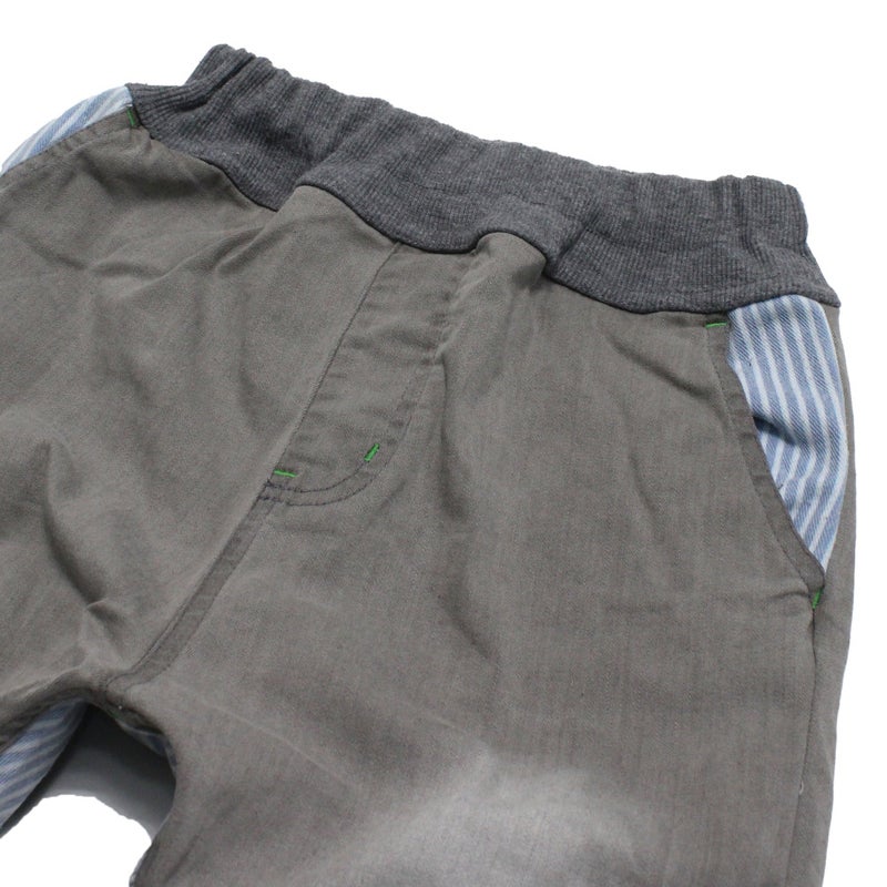 ブラックデニムにヒッコリーの切り替えが個性的なデザインです。