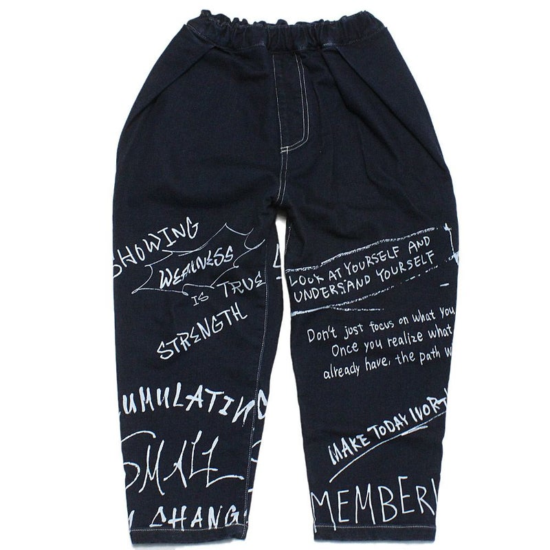 全体に落書き風のプリントを施したインパクトのあるパンツ。