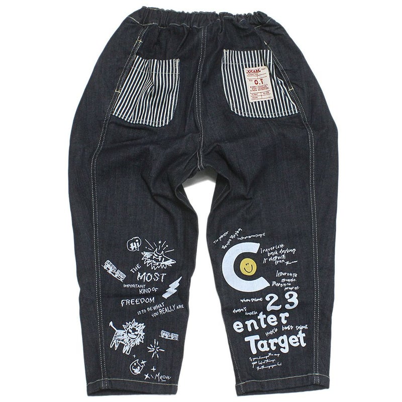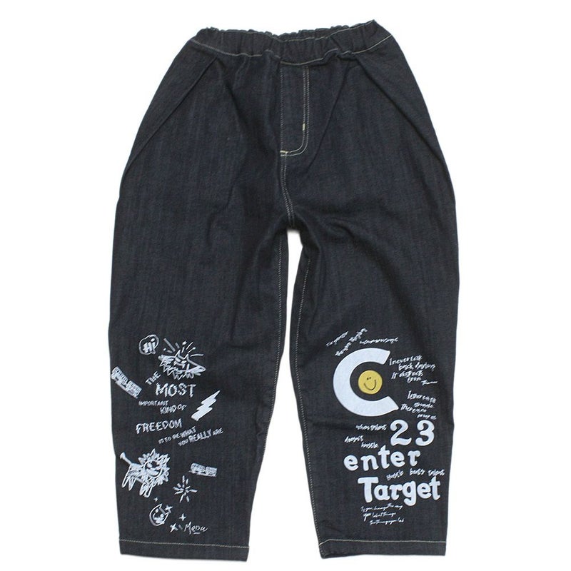 裾にプリントを施したデニムパンツ。