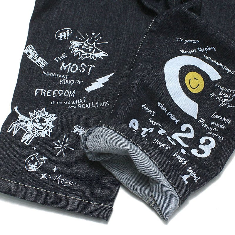 裾にプリントを施したデニムパンツ。