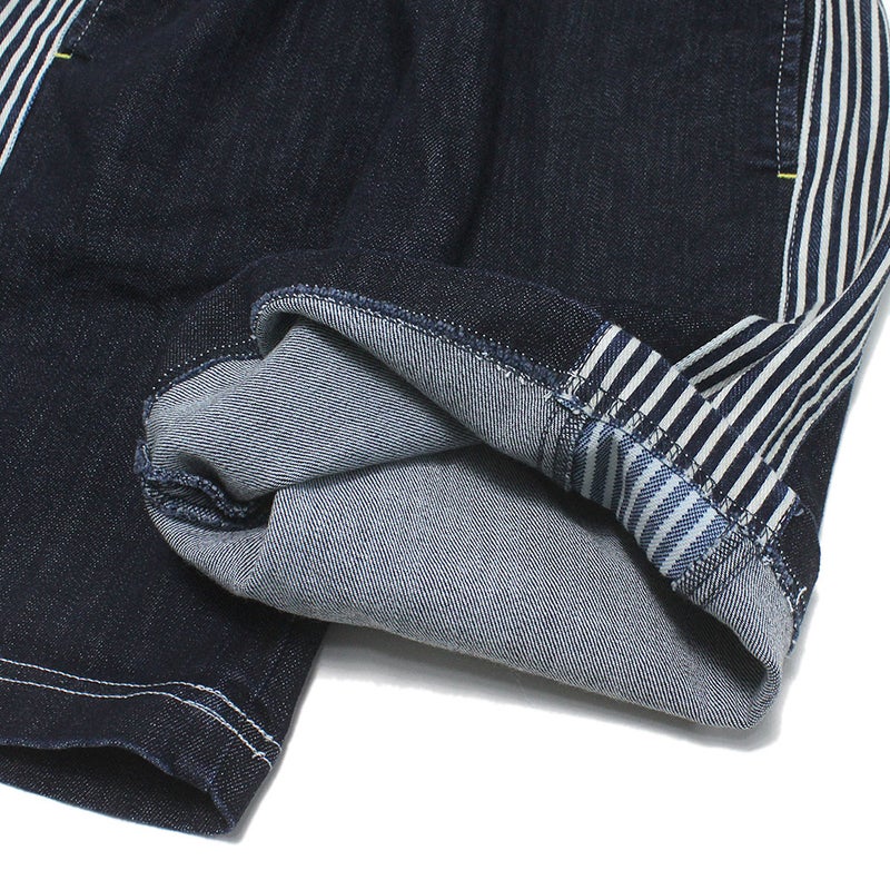サイドをヒッコリー地で切り替えたハーフパンツ。