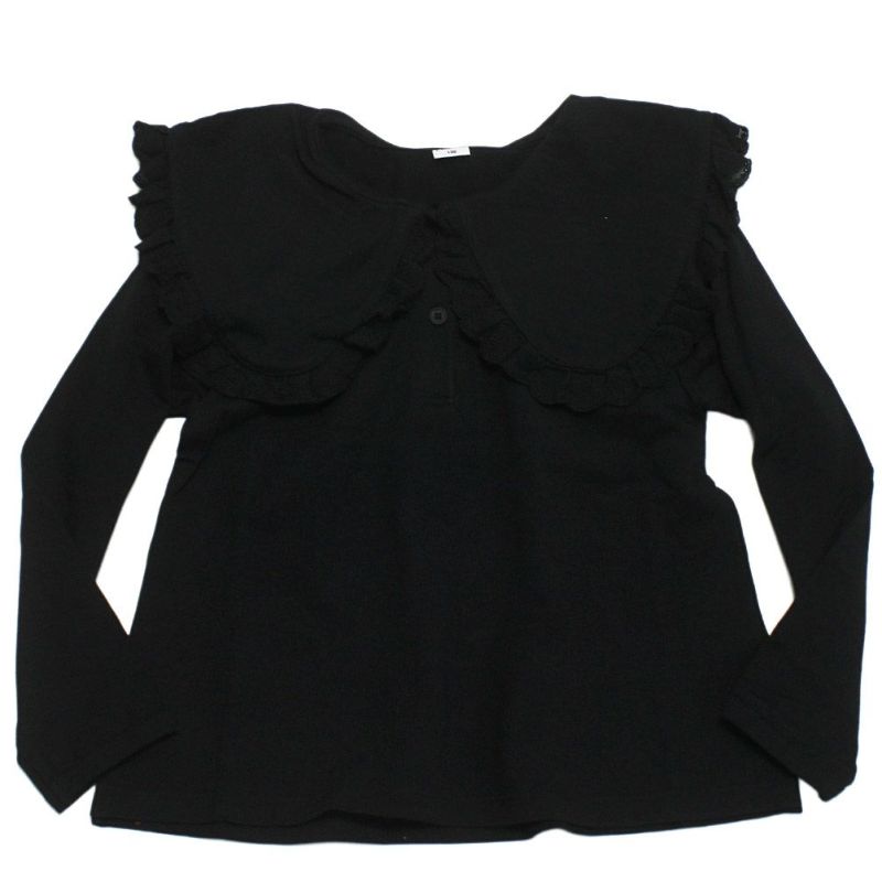 フリルの大きな衿がポイントになった長袖Tシャツ。