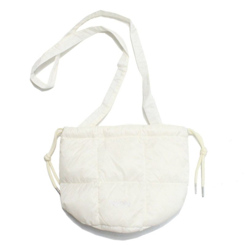 お出かけ時にちょうど良いサイズ感の巾着型ダウンバッグ。