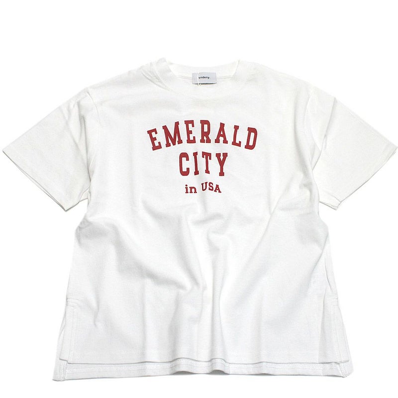 カレッジロゴが目を引くTシャツ。