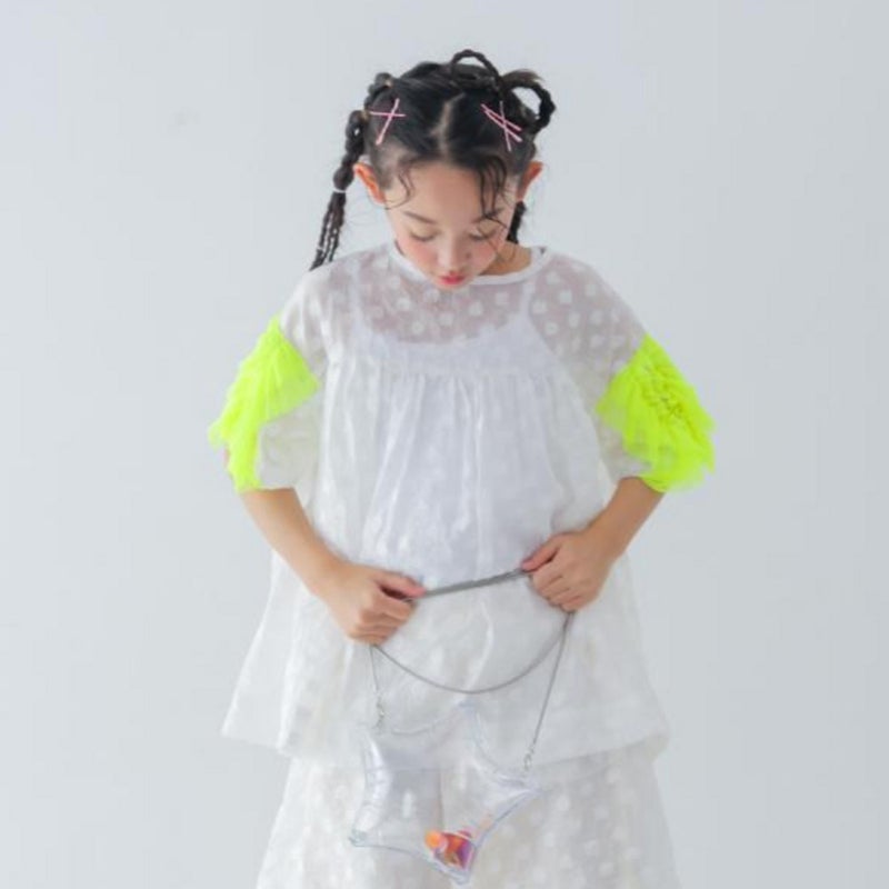 目の細かいネット素材をフリルのようにあしらったお袖がアクセントに。