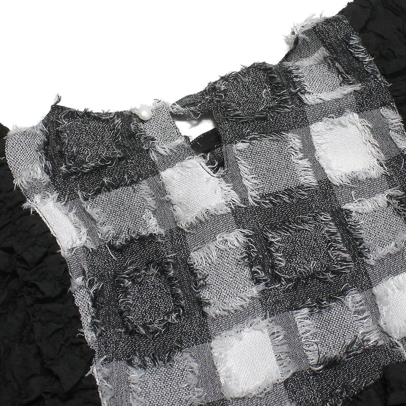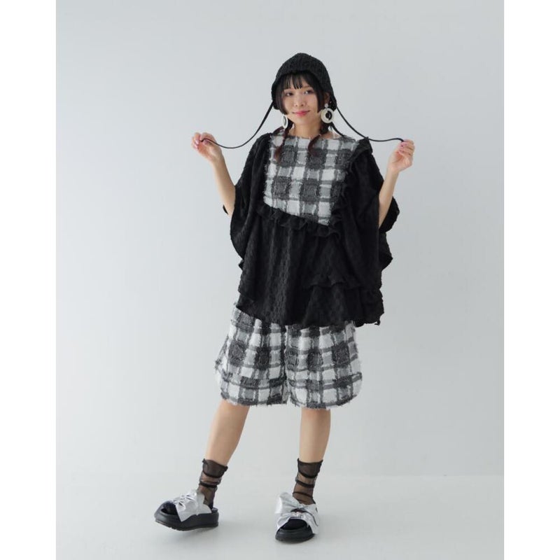 毛足の短いフリンジが特徴のチェック柄の生地を使用したドルマンスリーブブラウス。