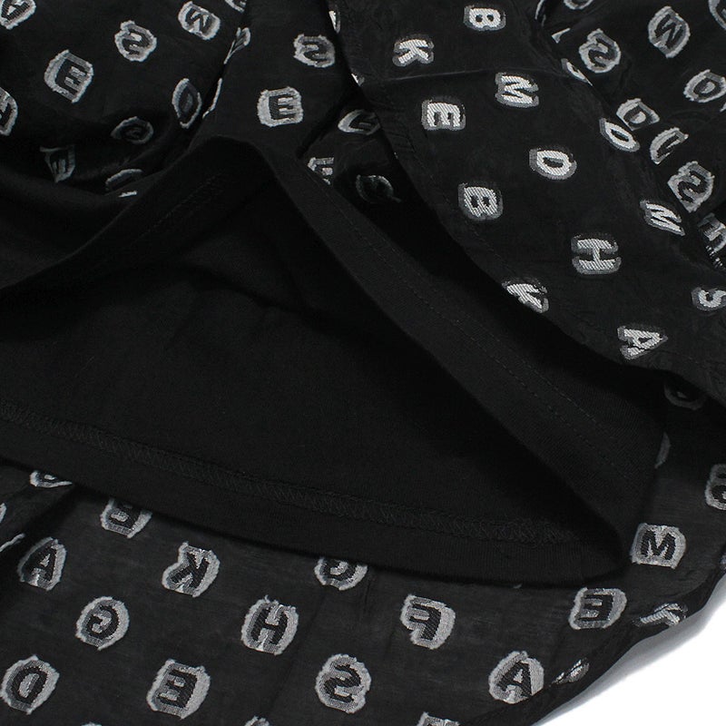 アルファベットが散りばめられた個性的なオーガンジー生地をたっぷりと使用したブラウス。