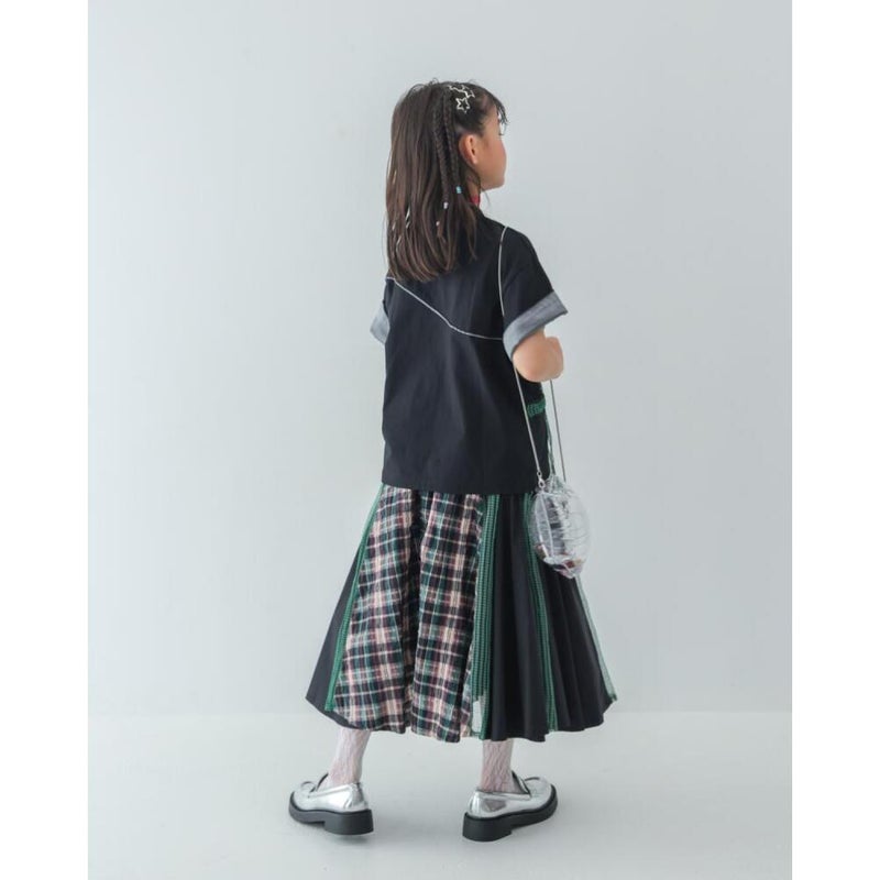生地感の異なるふたつのチェックを組み合わせたスカート。