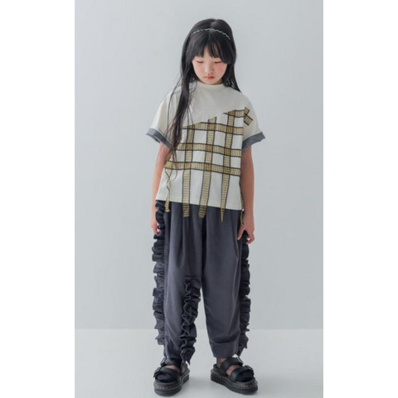 チュール生地のテープを大胆に組み合わせることで、動くたびにテープが揺れ動く遊び心溢れるTシャツです。