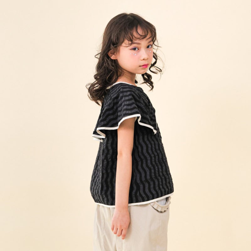リボンの形の大きな衿が印象的なブラウスです。