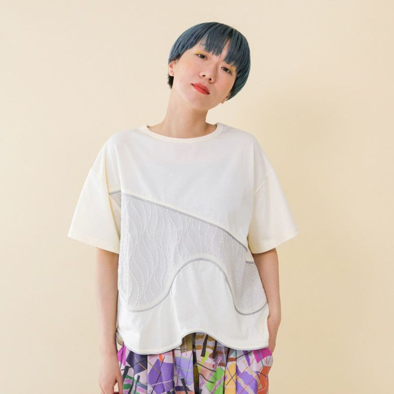 軽い天竺生地をベースに、切替部分には波打ち際のような柄の生地を使うことで爽やかな印象に。