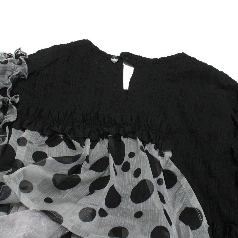大きさの異なるドットをランダムに散らした生地を肩からサイドへ