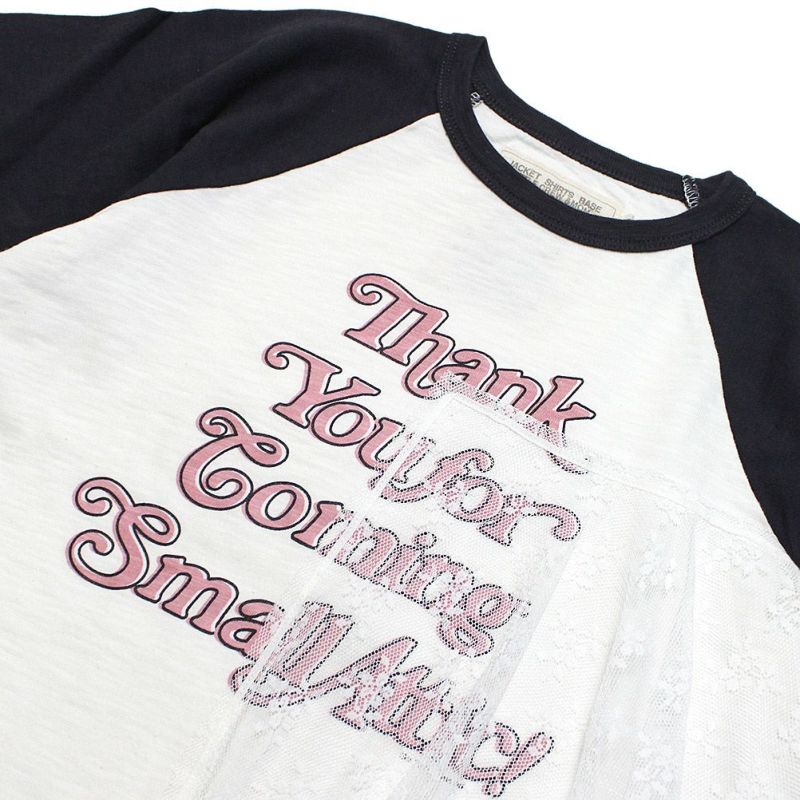 バンドTのようなプリントとラグラン配色が特徴。